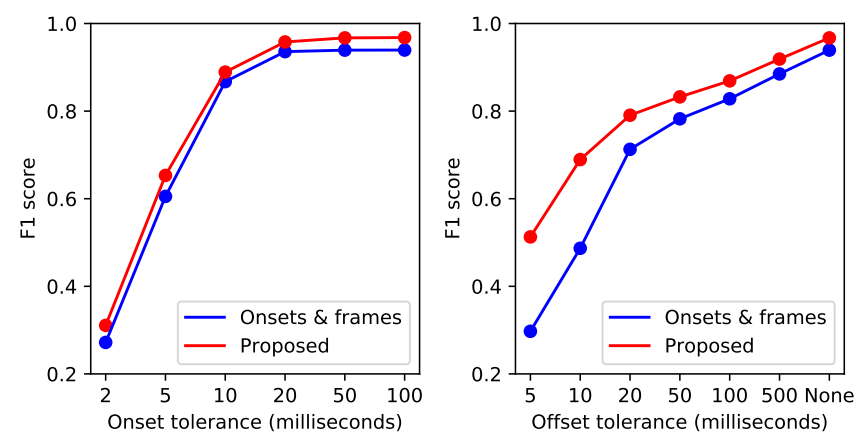 The evaluation follows standard AMT metrics – precision, recall, and F1-score – computed for both onsets and offsets at multiple temporal tolerances. These tests reveal a key strength of the regression formulation: it maintains high accuracy even under strict timing thresholds. In other words, when precise temporal alignment matters, this model shines.