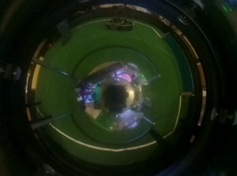 A Tinker Board single-board computer handled all computer vision tasks. The camera’s circular image was unwarped into a panoramic projection, and OpenCV-based image processing – implemented in Python – was used to detect the ball. The vision algorithm extracted the orange color of the ball from the RGB channels, filtered noise, and computed the ball’s angular bearing relative to the robot. Temporal smoothing of detections improved stability, especially when the ball moved quickly or was partially occluded by other objects.