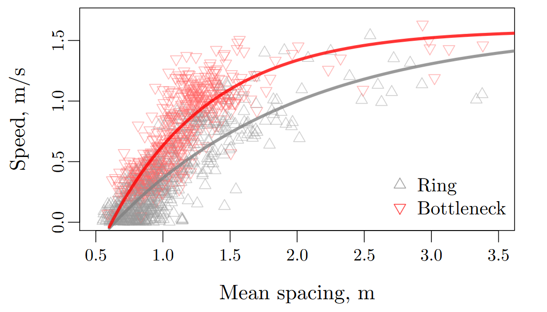 - Ring experiment: Participants walk in a circular corridor, maintaining continuous flow. Densities range roughly between 0.25 and 2 ped/m².
