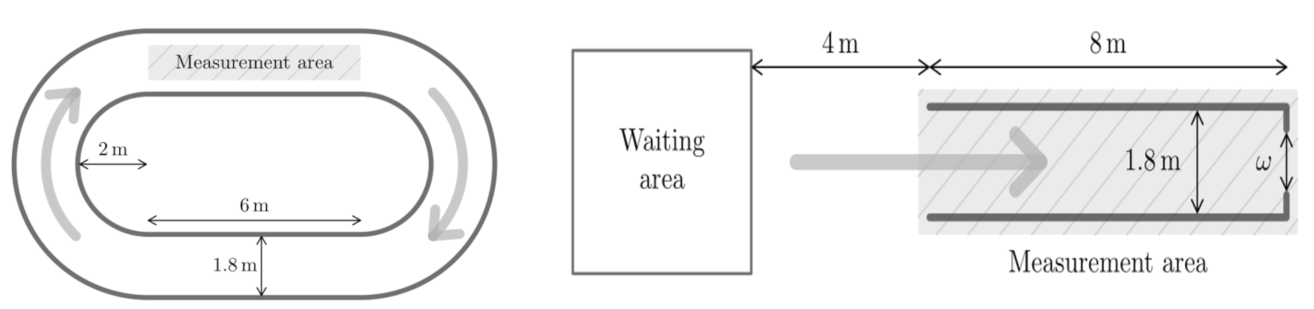- Bottleneck experiment: The same participants pass through a narrowing corridor with variable exit widths \(0.7–1.8 m\), generating intermittent stop-and-go dynamics.