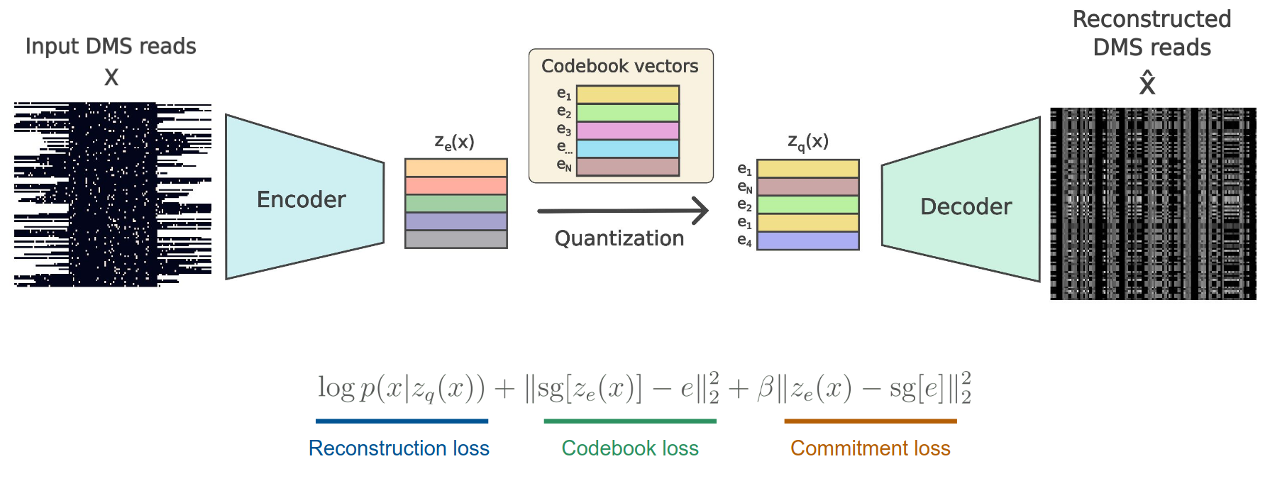 Vector-Quantized VAEs produce a discrete latent representation by mapping encoder outputs to a small codebook of prototypes. Formally, an encoder produces continuous vectors \(z_e\) which are quantized to the nearest codebook vectors \(z_q\) drawn from \(E={e_1,\dots,e_K}\). Discrete latents are desirable when the goal is to partition reads into a small number of conformational states (e.g., \(K=4\) codebook entries in the experiments). The codebook is optimized jointly with the encoder and decoder via a combination of reconstruction and codebook/commitment losses, stabilised using the straight-through estimator for gradient flow [2].