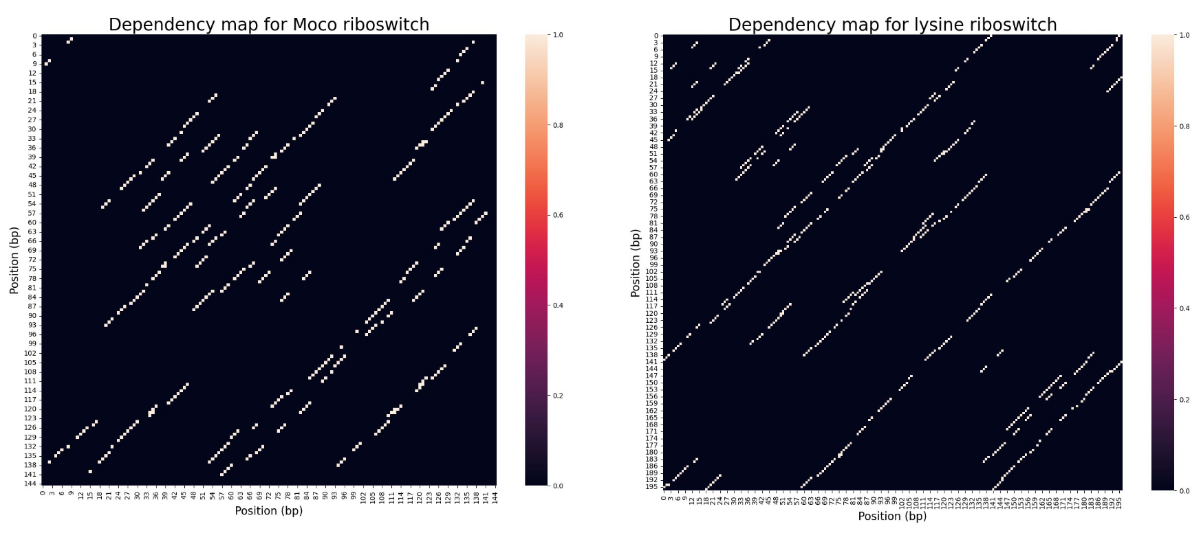 A dependency map captures pairwise associations between nucleotide positions (for example, derived from a language model, covariance analysis, or prior structural predictions). Conceptually, it encodes which positions are likely to be interacting (e.g., base pairs) or otherwise co-constrained. The dependency map can be used in multiple ways: